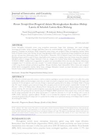 Puspitarini, Nurul Aisyiyah and Hastutiningtyas, Wahidyanti R. (2025) Peran Terapi Otot Progresif dalam Meningkatkan Kualitas Hidup Lansia di Sekolah Lansia Kota Malang. Journal of Innovative and Creativity, 5 (2). ISSN 2776-771x