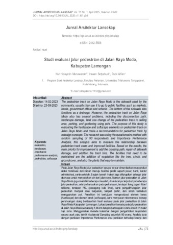 Munawaroh, Nur Hidayatin and Setyabudi, Irawan and Alfian, Rizki (2025) Studi evaluasi jalur pedestrian di Jalan Raya Modo, Kabupaten Lamongan. Jurnal Arsitektur Lanskap, 11 (1). pp. 73-82. ISSN 2442-5508